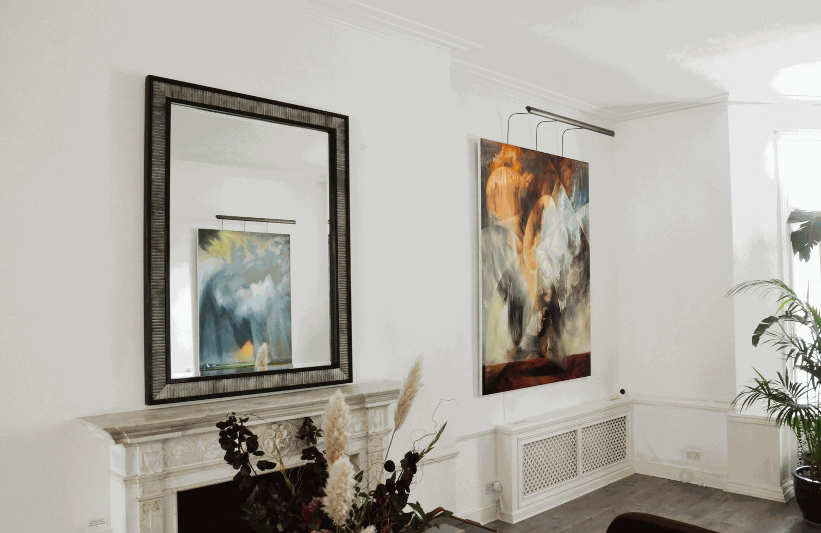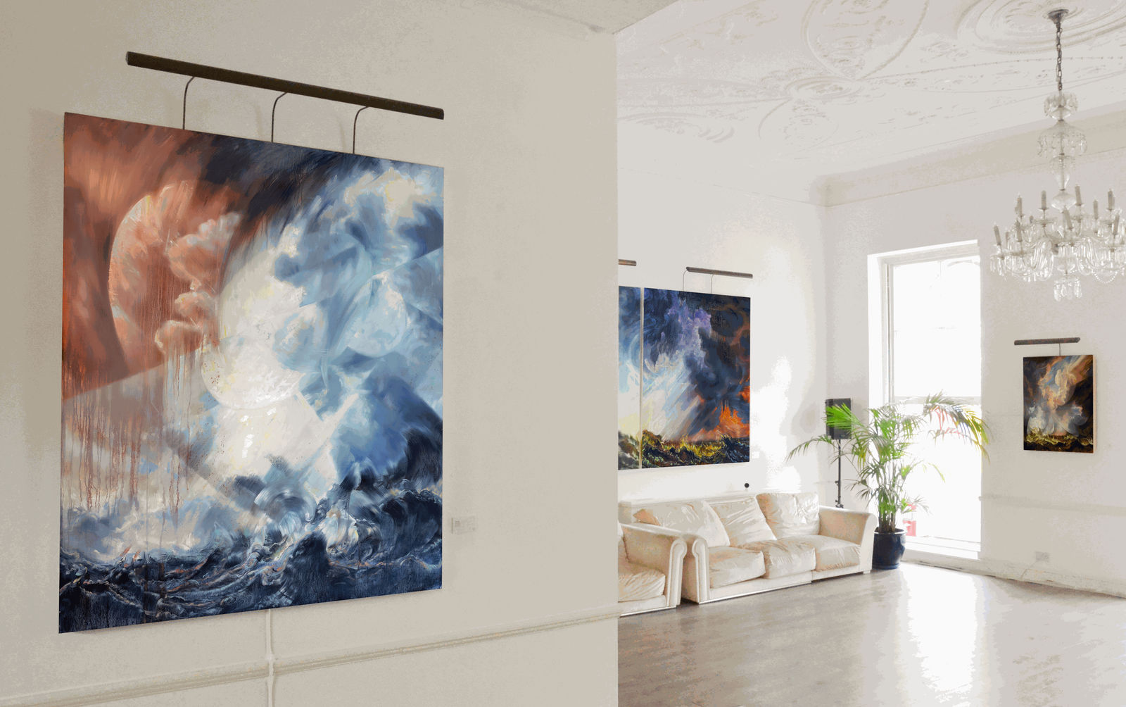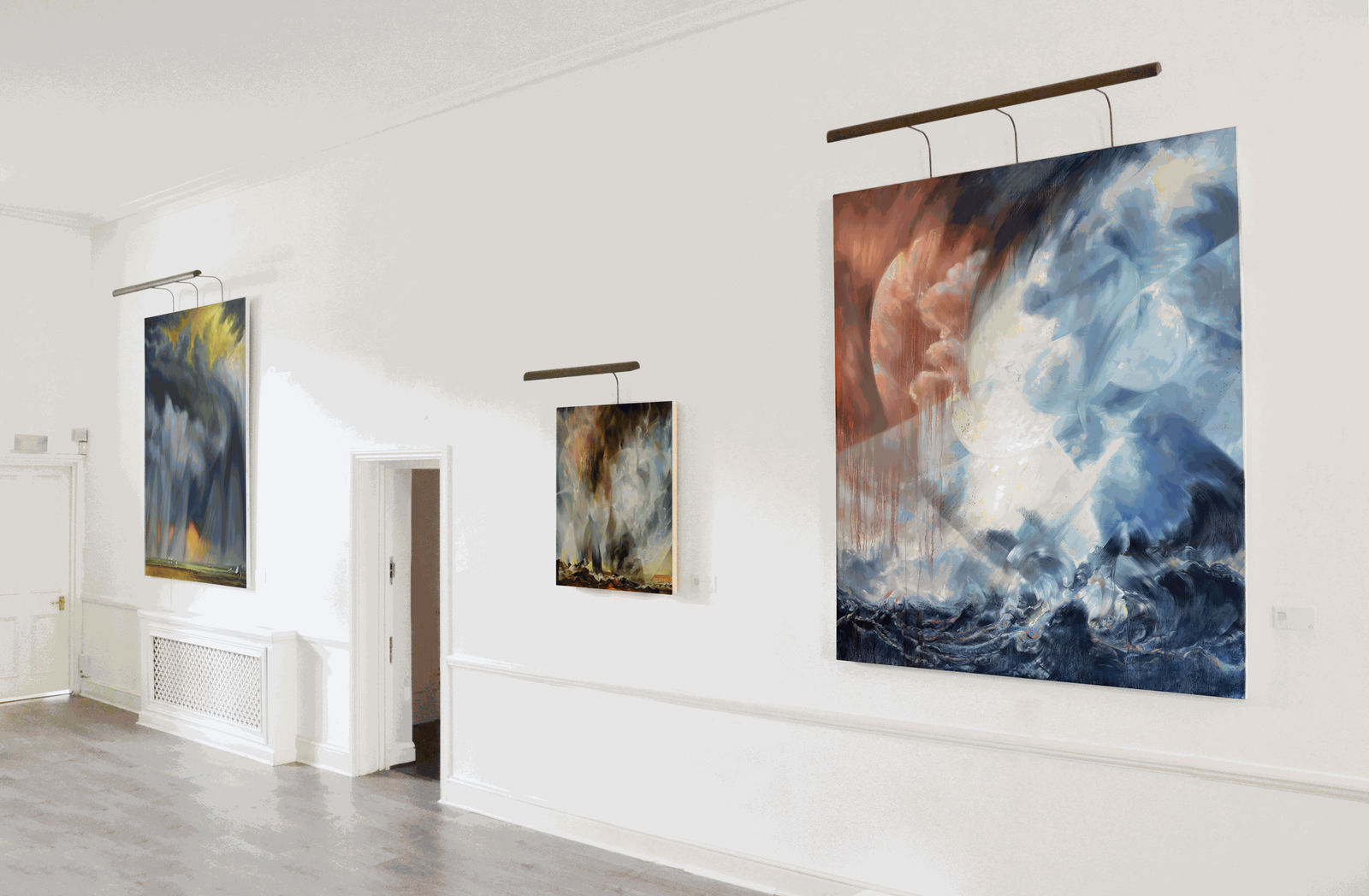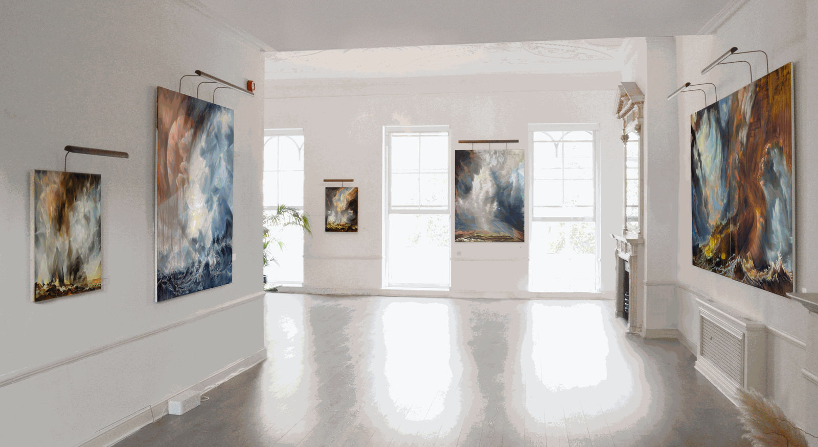 Kreyn’s storms take direct root in her painting of The Tempest (commissioned by Andrew Lloyd Webber as part of Kreyn’s 8-painting Shakespeare Cycle, now on permanent display in the lobby of the historic Theater Royal Drury Lane). Her background in highly refined figurative painting provides the sense of drawing and representational rendering that permeates and enhances the abstract marks of her recent work. Her education in mathematics and philosophy, and other interests in neuroscience and mythology, lead Kreyn to atypical connections between disparate fields. She distills these references into a personal vocabulary of forms and geometries that result in hybrid landscapes situated at the intersection of formalism, abstract expressionism, and Romantic painting.